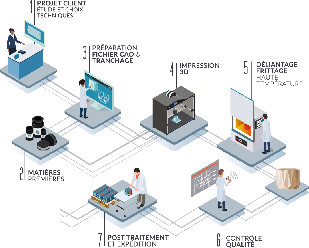 La production de pièces céramiques en fabrication additive, ou impression 3D, s’appuie sur des technologies de pointe qui demandent un savoir-faire rare. Elle nécessite une expertise poussée dans l’ingénierie des céramiques, la conception 3D et la maitrise des processus industriels. L’enjeu : produire des pièces d’excellence aux géométries impossibles à obtenir autrement.